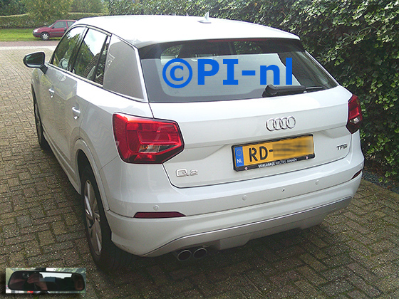 Parkeersensoren (set D 2024) ingebouwd door PI-nl in een Audi Q2 met canbus uit 2017. De spiegeldisplay is van de set met bumpercamera en sensoren.